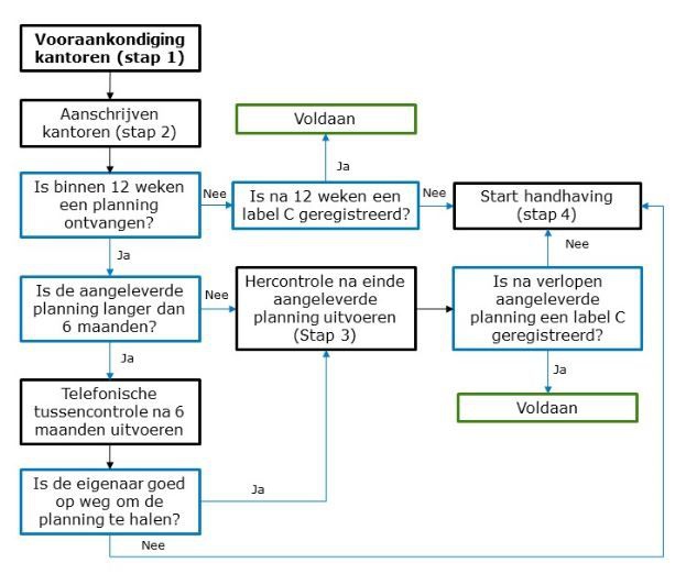 Net als bij de label-C verplichting voor kantoren houden gemeenten of hun omgevingsdienst toezicht op naleving van de bovengenoemde regels. Wanneer je minimaal 20 gebouwen in 2 verschillende omgevingsdiensten hebt en harder wilt lopen dan de norm, mag je meedoen (word je beloond?) met een ander soort toezicht.
